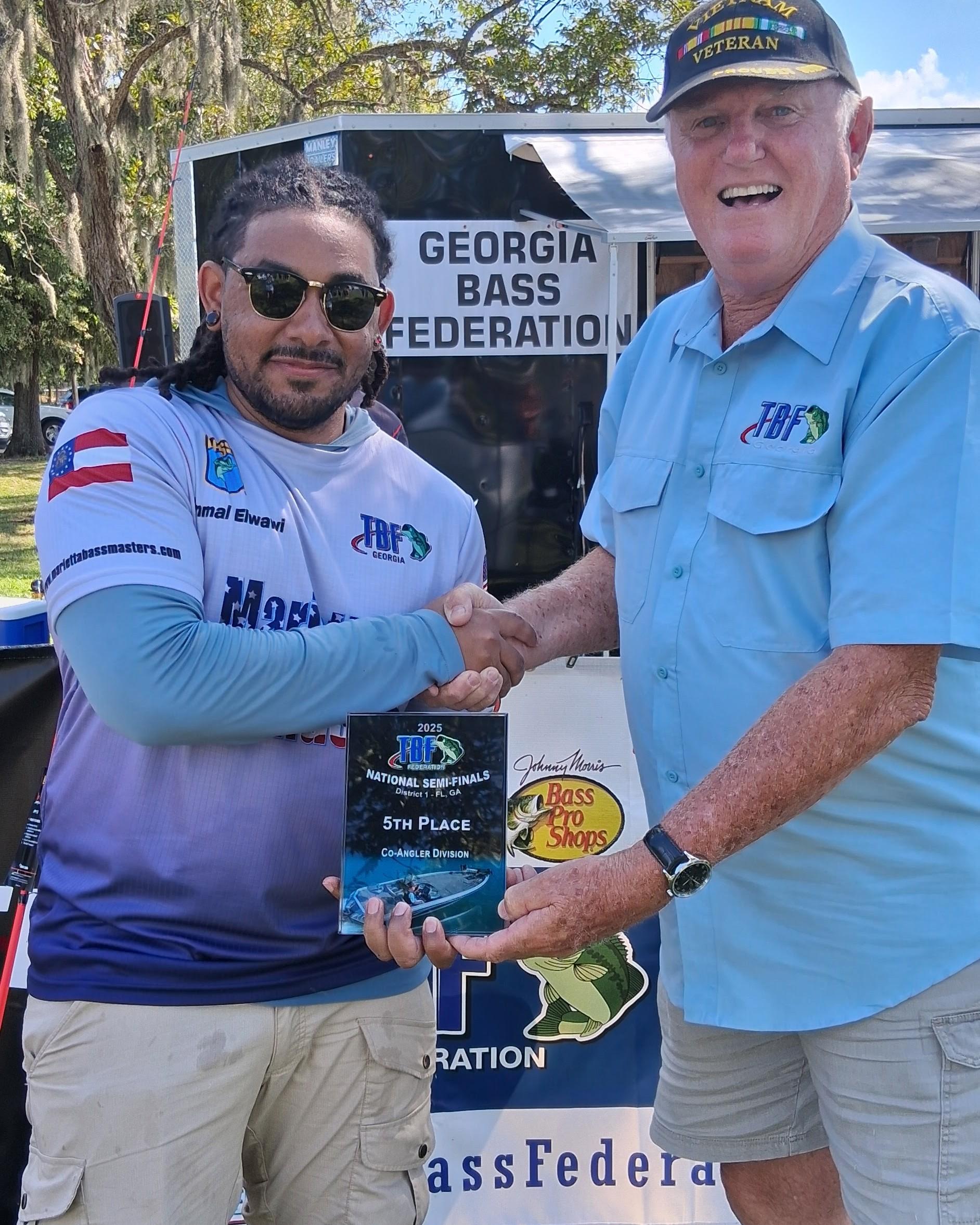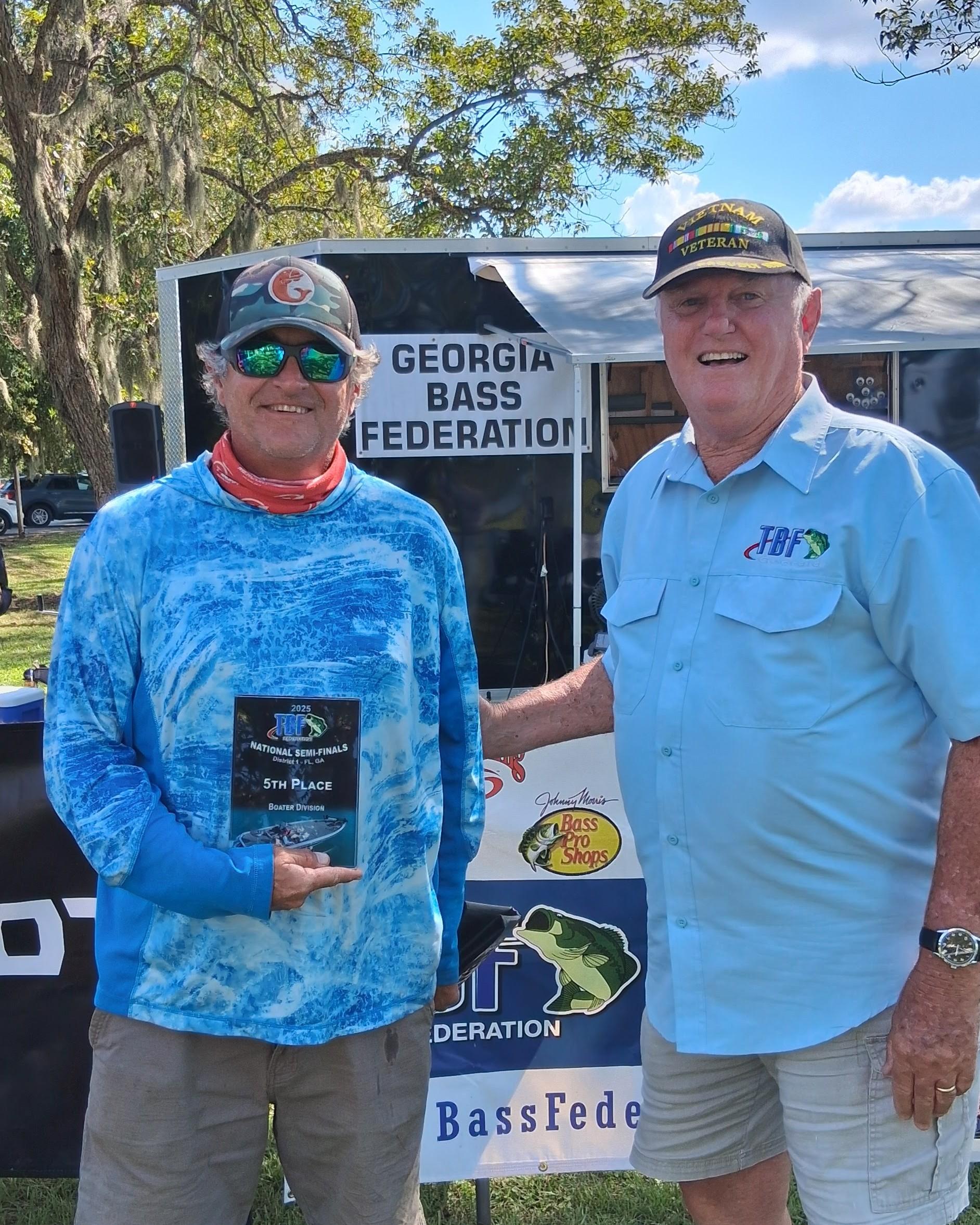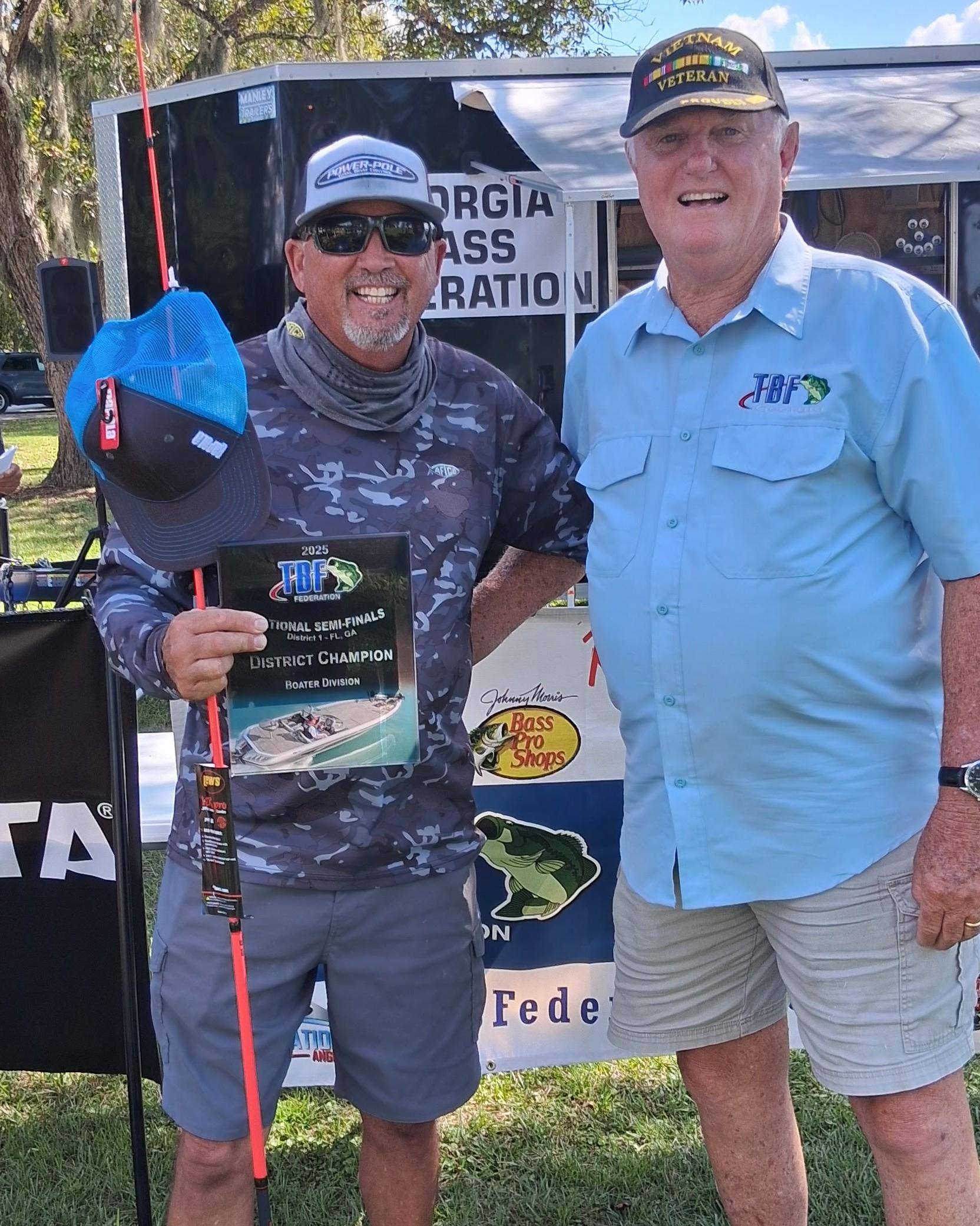 Overall winners for the 2025 District 1 TBF GA-FL National Semi Finals were Jesse Tacoronte of the Florida Bass Federation with eight (8) bass weighing 21 pounds 8 ounces on the Boater’s side and Gene Willis of the Georgia Bass Federation with five (5) bass weighing 11 pounds 11 ounces on the Co-angler’s side.