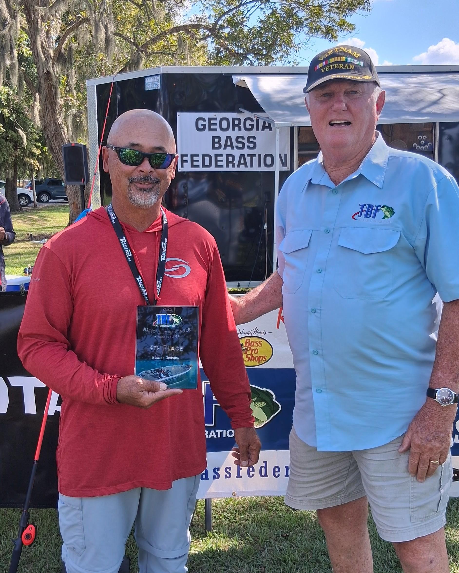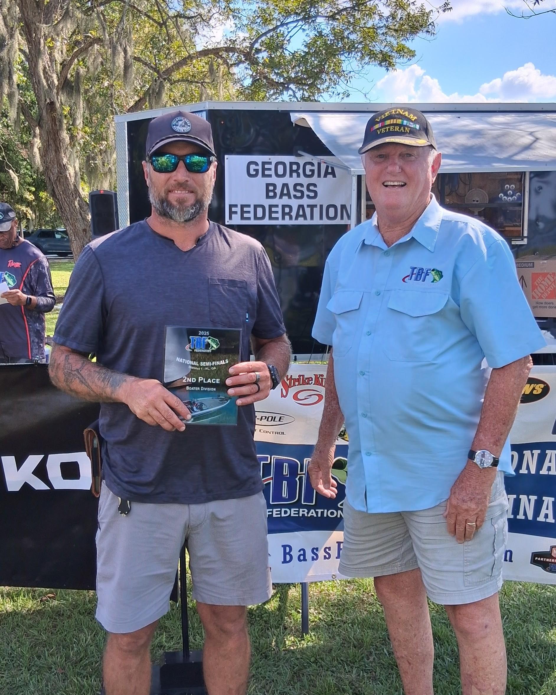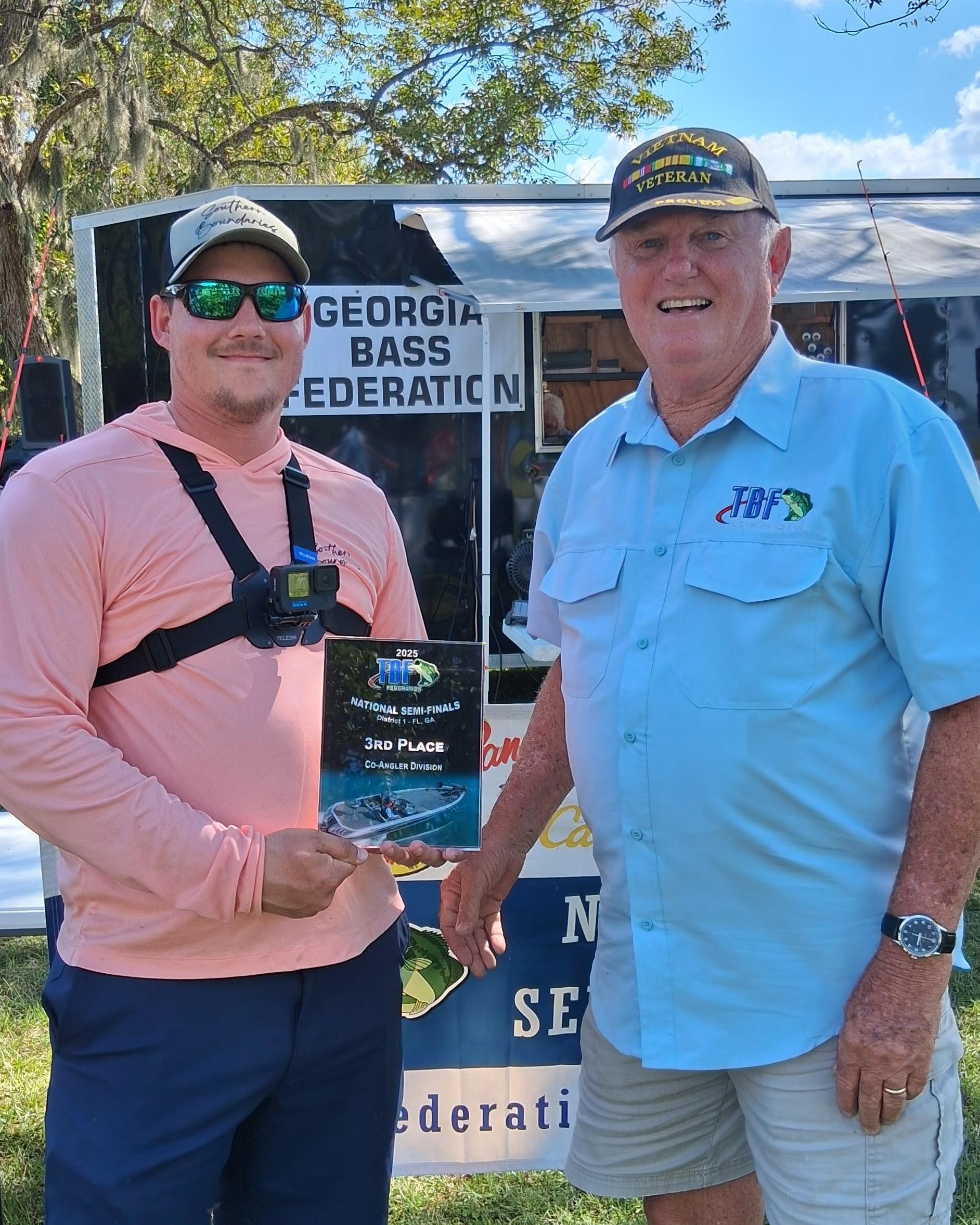 Overall winners for the 2025 District 1 TBF GA-FL National Semi Finals were Jesse Tacoronte of the Florida Bass Federation with eight (8) bass weighing 21 pounds 8 ounces on the Boater’s side and Gene Willis of the Georgia Bass Federation with five (5) bass weighing 11 pounds 11 ounces on the Co-angler’s side.