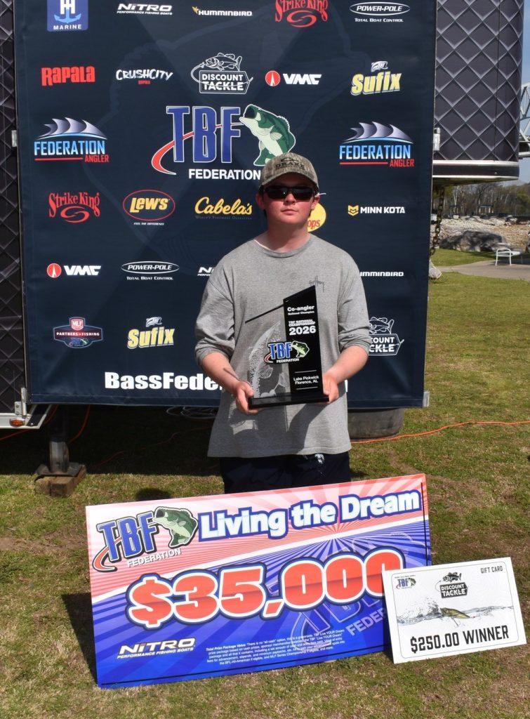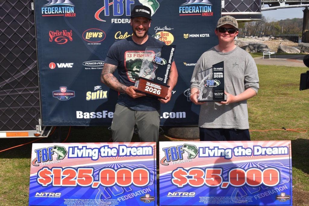 Nolan Clark not only locked in a win as the 2026 Co-angler National Champion and his $35, 000 prize package. He also won his districts TBF National Semi final (adult program event) last fall to earn his slot in this National Championship AND in doing so became the youngest angler in the federations 58 year history to win a national champion title of any kind! Clark mentioned on stage how thankful he was for his daily boaters and how well they worked together each day for him to have a shot at winning. You should watch for this young man’s name in the headlines in the future, we will see him on the winner podium again. For his win, Nolan received $20,000 in cash, advancement to the BFL All -American, advancement to the Toyota series Championship, paid entry fee stipends to fish whatever he wishes to fish for a year, $250 gift card from discount tackle.com, a Minn Kota trolling motor, Humminbird electronics and a Power pole to help him make the jump to the boater side and MORE!